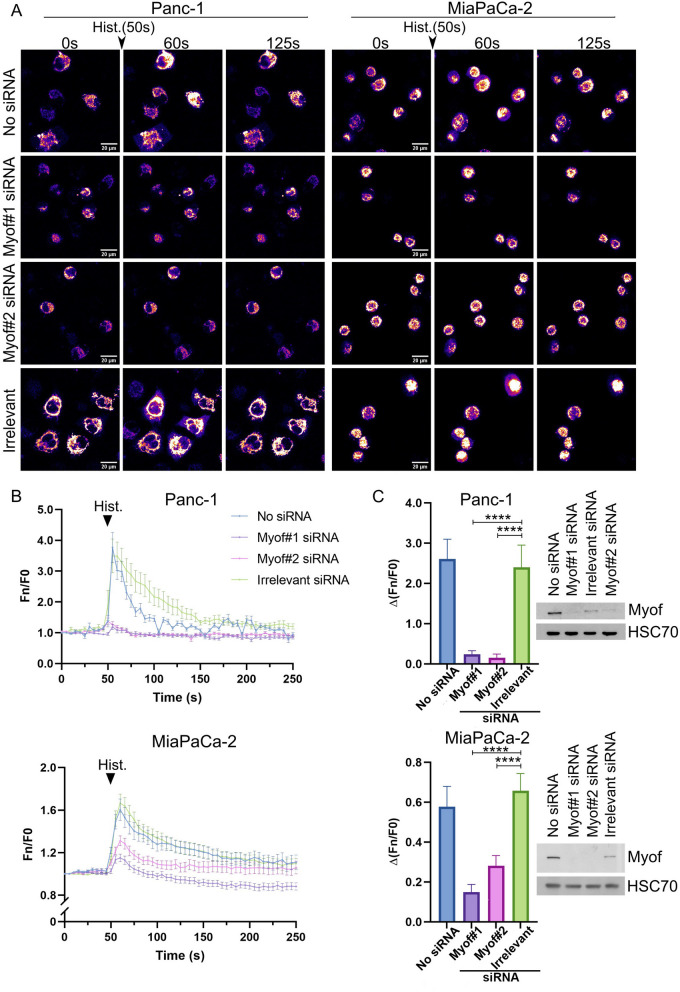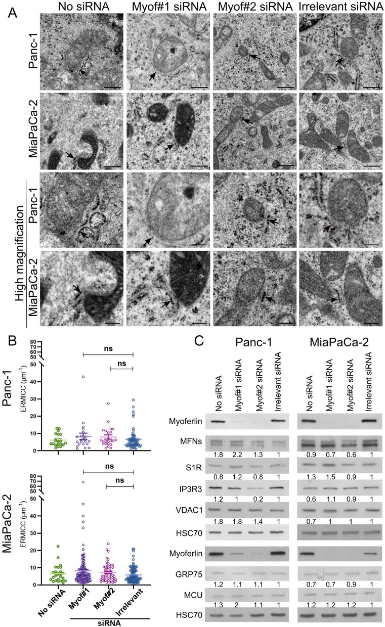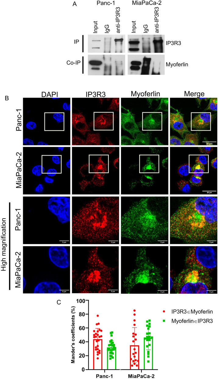 Methods: Experiments were performed on two pancreas cancer cell lines, Panc-1 and MiaPaCa-2. Myoferlin localization on mitochondria was evaluated by immunofluorescence, proximity ligation assay, and cell fractionation. The presence of myoferlin in mitochondria-associated membranes was assessed by cell fractionation and its function in mitochondrial calcium transfer was evaluated using calcium flow experiments, proximity ligation assays, co-immunoprecipitation, and timelapse fluorescence microscopy in living cells.