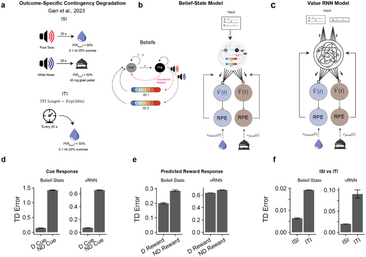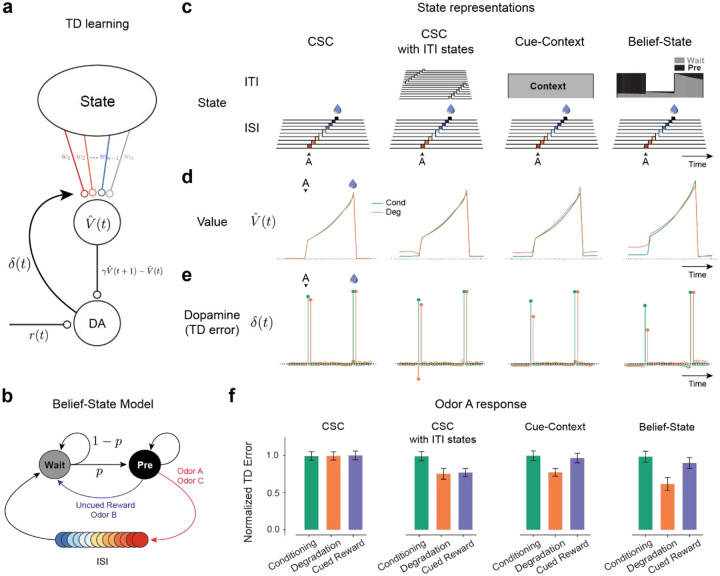 Associative learning depends on contingency, the degree to which a stimulus predicts an outcome. Despite its importance, the neural mechanisms linking contingency to behavior remain elusive. Here we examined the dopamine activity in the ventral striatum - a signal implicated in associative learning - in a Pavlovian contingency degradation task in mice. We show that both anticipatory licking and dopamine responses to a conditioned stimulus decreased when additional rewards were delivered uncued, but remained unchanged if additional rewards were cued. These results conflict with contingency-based accounts using a traditional definition of contingency or a novel causal learning model (ANCCR), but can be explained by temporal difference (TD) learning models equipped with an appropriate inter-trial-interval (ITI) state representation. Recurrent neural networks trained within a TD framework develop state representations like our best 'handcrafted' model. Our findings suggest that the TD error can be a measure that describes both contingency and dopaminergic activity.