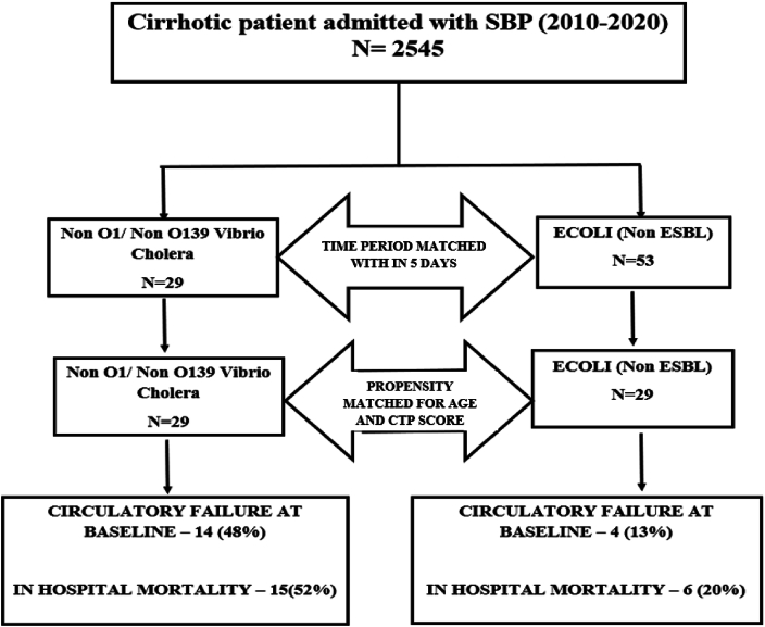 Methods: Hospital information system of patients with cirrhosis admitted with bacteraemia and/or SBP from 2010 to 2020 was searched to include patients with NOVC infection. Non-ESBL E. coli bacteraemia/bacterascites were chosen as a comparator group, matched for the date of admission within 5 days of index case. Propensity score matching (PSM) was done for patient's age and Child score to compare outcome at discharge between NOVC-infected and E. coli-infected cirrhotic patients.