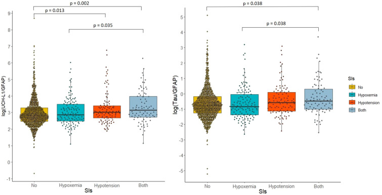 Conclusion: Though less frequent than previously described, SIs in TBI patients are associated with higher release of neuronal than glial injury biomarkers and with increased requirements for ICU therapies aimed at reducing intracranial hypertension. Hypotension or combined SIs are significantly associated with adverse 6-month outcomes. Current criteria for hypotension may lead to higher biomarker levels and more negative outcomes than those for hypoxemia suggesting a need to revisit pressure targets in the prehospital settings.