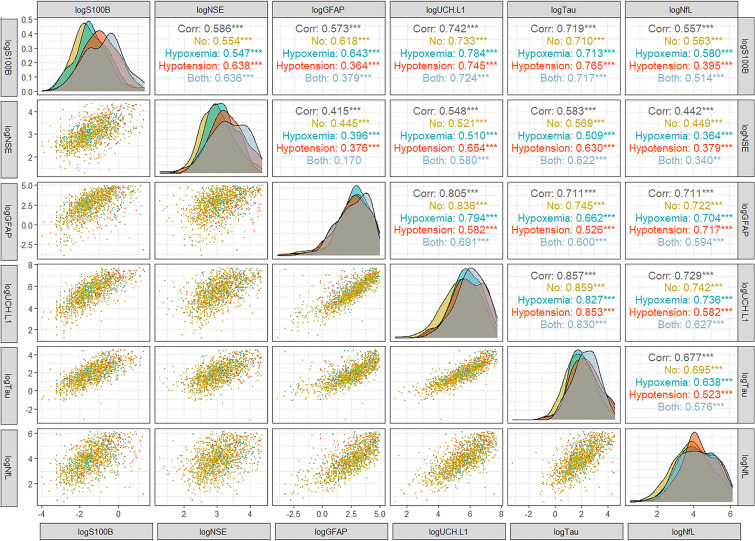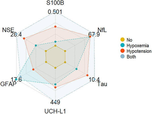 Results: Among 1695 TBI patients, 24.5% had SIs: 16.1% had hypoxemia, 15.2% had hypotension, and 6.8% had both. Biomarkers differed by SI category, with higher S100B, Tau, UCH-L1, NSE and NfL values in patients with hypotension or both SIs. The ratio of neural to glial injury (quantified as UCH-L1/GFAP and Tau/GFAP ratios) was higher in patients with hypotension than in those with no SIs or hypoxia alone. At 6 months, 380 patients died (22%), and 759 (45%) had GOSE ≤ 4. Patients who experienced at least one SI had higher mortality than those who did not (31.8% vs. 19%, p < 0.001).