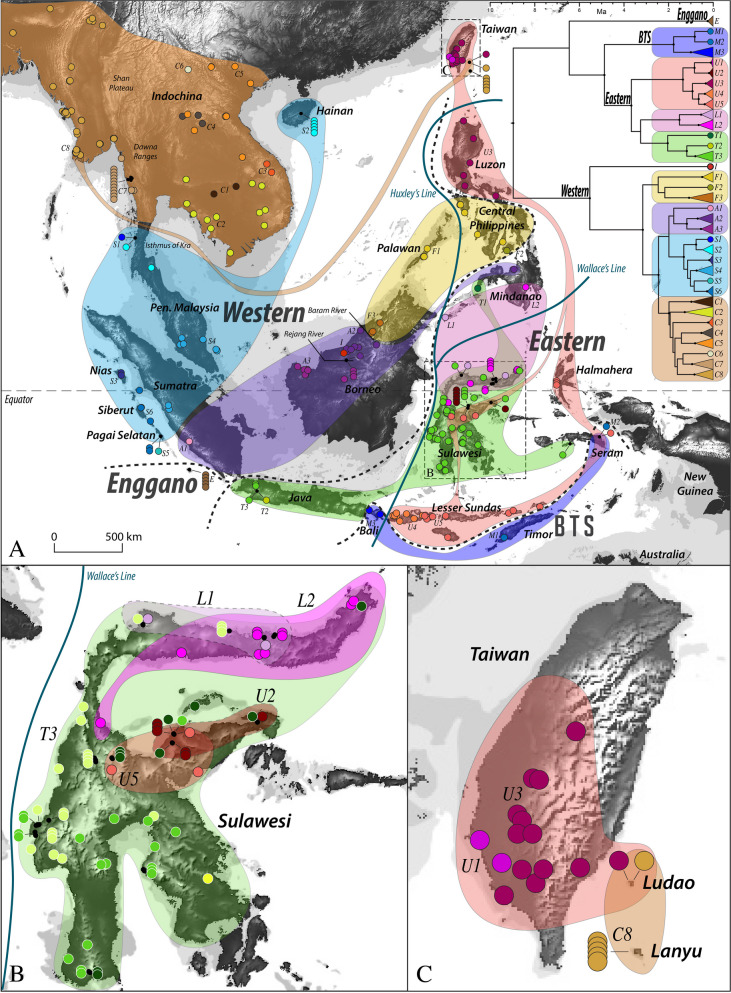 Conclusions: Most of enormous range of E. multifasciata across Southeast Asia is native and it only displays signs of human-introduction or recent expansion along the eastern and northern fringe of its range. There were at least three events of human-introductions to Taiwan and offshore islands, and several oceanic islands in eastern Indonesia show a similar pattern. In Myanmar and Hainan, there is a founder-effect consistent with post-warming expansion after the last glacial maxima or human introduction.