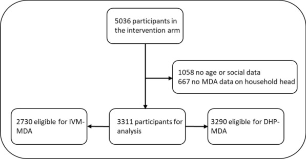 Background: Mass Drug Administration (MDA) has become a mainstay for the control of several diseases over the last two decades. Successful implementation of MDA programmes requires community participation and can be threatened by systematic non-participation. Such concerns are particularly pertinent for MDA programmes against malaria, as they require multi-day treatment over several consecutive months. Factors associated with non-participation to the MDA campaign with ivermectin (IVM) and dihydroartemisinin-piperaquine (DHP) implemented within the MASSIV cluster randomized trial were determined.