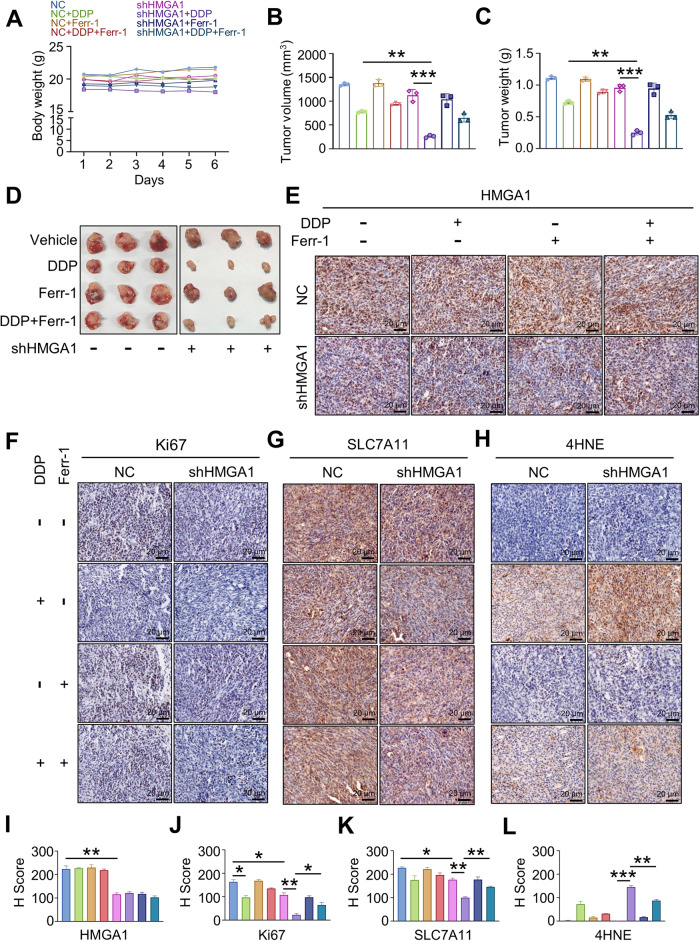 Chemotherapy is a primary treatment for esophageal squamous cell carcinoma (ESCC). Resistance to chemotherapeutic drugs is an important hurdle to effective treatment. Understanding the mechanisms underlying chemotherapy resistance in ESCC is an unmet medical need to improve the survival of ESCC. Herein, we demonstrate that ferroptosis triggered by inhibiting high mobility group AT-hook 1 (HMGA1) may provide a novel opportunity to gain an effective therapeutic strategy against chemoresistance in ESCC. HMGA1 is upregulated in ESCC and works as a key driver for cisplatin (DDP) resistance in ESCC by repressing ferroptosis. Inhibition of HMGA1 enhances the sensitivity of ESCC to ferroptosis. With a transcriptome analysis and following-up assays, we demonstrated that HMGA1 upregulates the expression of solute carrier family 7 member 11 (SLC7A11), a key transporter maintaining intracellular glutathione homeostasis and inhibiting the accumulation of malondialdehyde (MDA), thereby suppressing cell ferroptosis. HMGA1 acts as a chromatin remodeling factor promoting the binding of activating transcription factor 4 (ATF4) to the promoter of SLC7A11, and hence enhancing the transcription of SLC7A11 and maintaining the redox balance. We characterized that the enhanced chemosensitivity of ESCC is primarily attributed to the increased susceptibility of ferroptosis resulting from the depletion of HMGA1. Moreover, we utilized syngeneic allograft tumor models and genetically engineered mice of HMGA1 to induce ESCC and validated that depletion of HMGA1 promotes ferroptosis and restores the sensitivity of ESCC to DDP, and hence enhances the therapeutic efficacy. Our finding uncovers a critical role of HMGA1 in the repression of ferroptosis and thus in the establishment of DDP resistance in ESCC, highlighting HMGA1-based rewiring strategies as potential approaches to overcome ESCC chemotherapy resistance. Schematic depicting that HMGA1 maintains intracellular redox homeostasis against ferroptosis by assisting ATF4 to activate SLC7A11 transcription, resulting in ESCC resistance to chemotherapy.