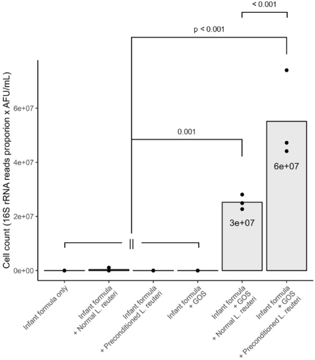 A probiotic-related benefit for the host is inherently linked to metabolic activity and integration in the gut ecosystem. To facilitate these, probiotics are often combined with specific prebiotics in a synbiotic formulation. Here, we propose an approach for improving probiotic metabolic activity and engraftment. By cultivating the probiotic strain in the presence of a specific prebiotic (preconditioning), the bacterial enzymatic machinery is geared towards prebiotic consumption. Today, it is not known if preconditioning constitutes an advantage for the synbiotic concept. Therefore, we assessed the effects galacto-oligosaccharide (GOS) addition and preconditioning on GOS of Limosilactobacillus reuteri DSM 17938 on ex vivo colonic metabolic profiles, microbial community dynamics, and osteoblastogenesis. We show that adding GOS and preconditioning L. reuteri DSM 17938 act on different scales, yet both increase ex vivo short-chain fatty acid (SCFA) production and engraftment within the microbial community. Furthermore, preconditioned supernatants or SCFA cocktails mirroring these profiles decrease the migration speed of MC3T3-E1 osteoblasts, increase several osteogenic differentiation markers, and stimulate bone mineralization. Thus, our results demonstrate that preconditioning of L. reuteri with GOS may represent an incremental advantage for synbiotics by optimizing metabolite production, microbial engraftment, microbiome profile, and increased osteoblastogenesis.