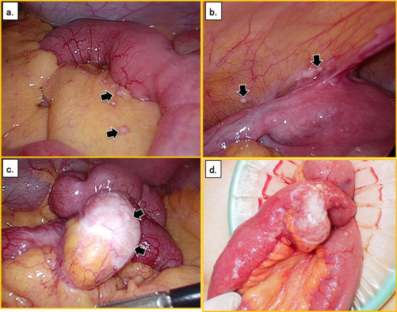 Case presentation: A woman in her sixties presented to another hospital with abdominal pain. Plain computed tomography suggested an abdominal tumor and she was referred to our hospital. Enhanced computed tomography revealed a 23-mm low-density tumor in the abdominal cavity. Surgery was performed with a tentative diagnosis of a mesenteric tumor, such as a gastrointestinal stromal tumor, schwannoma, or lymphoma. First, we inspected the peritoneal cavity with a laparoscope. This revealed numerous nodules in the small bowel mesentery, suggesting peritoneal dissemination. A 20-mm-diameter white tumor was found in the small intestine and diagnosed as a small intestinal cancer. The small intestine was partially resected laparoscopically through a small skin incision. The patient's postoperative course was uneventful, and she was discharged on postoperative day 9. Pathological examination revealed well-differentiated adenocarcinoma in the small intestine. The tumor had developed from a sac-like portion protruding toward the serosal side and had a glandular structure lined with flattened atypical cells. Neither pancreatic acinar cells nor islets of Langerhans were evident, suggesting a Heinrich type 3 ectopic pancreas. The final diagnosis was an adenocarcinoma originating from an ectopic pancreas in Meckel's diverticulum. After a smooth recovery, the patient commenced chemotherapy for pancreatic cancer.