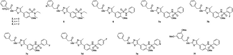 Human rhinoviruses (hRVs) cause upper and lower respiratory tract infections and exacerbate asthma and chronic obstructive pulmonary disease. hRVs comprise more than 160 strains with considerable genetic variation. Their high diversity and strain-specific interactions with antisera hinder the development of anti-hRV therapeutic agents. Phosphatidylinositol-4-kinase IIIβ (PI4KIIIβ) is a key enzyme in the phosphoinositide signalling pathway that is crucial for the replication and survival of various viruses. We identified novel PI4KIIIβ inhibitors, N-(4-methyl-5-arylthiazol)-2-amide derivatives, by generating a hit compound, 1a, from the high-throughput screening of a chemical library, followed by the optimization study of 1a. Inhibitor 7e exhibited the highest activity (EC50 = 0.008, 0.0068, and 0.0076 μM for hRV-B14, hRV-A16, and hRV-A21, respectively) and high toxicity (CC50 = 6.1 μM). Inhibitor 7f showed good activity and low toxicity and provided the highest selectivity index (SI ≥ 4638, >3116, and >2793 for hRV-B14, hRV-A16, and hRV-A21, respectively). Furthermore, 7f showed broad-spectrum activities against various hRVs, coxsackieviruses, and other enteroviruses, such as EV-A71 and EV-D68. The binding mode of the inhibitors was investigated using 7f, and the experimental results of plaque reduction, replicon and cytotoxicity, and time-of-drug-addition assays suggested that 7f acts as a PI4KIIIβ inhibitor. The kinase inhibition activity of this series of compounds against PI4KIIIα and PI4KIIIβ was assessed, and 7f demonstrated kinase inhibition activity with an IC50 value of 0.016 μM for PI4KIIIβ, but not for PI4KIIIα (>10 μM). Therefore, 7f represents a highly potent and selective PI4KIIIβ inhibitor for the further development of antiviral therapy against hRVs or other enteroviruses.