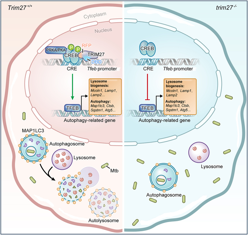 Infectious diseases, such as Mycobacterium tuberculosis (Mtb)-caused tuberculosis (TB), remain a global threat exacerbated by increasing drug resistance. Host-directed therapy (HDT) is a promising strategy for infection treatment through targeting host immunity. However, the limited understanding of the function and regulatory mechanism of host factors involved in immune defense against infections has impeded HDT development. Here, we identify the ubiquitin ligase (E3) TRIM27 (tripartite motif-containing 27) as a host protective factor against Mtb by enhancing host macroautophagy/autophagy flux in an E3 ligase activity-independent manner. Mechanistically, upon Mtb infection, nuclear-localized TRIM27 increases and functions as a transcription activator of TFEB (transcription factor EB). Specifically, TRIM27 binds to the TFEB promoter and the TFEB transcription factor CREB1 (cAMP responsive element binding protein 1), thus enhancing CREB1-TFEB promoter binding affinity and promoting CREB1 transcription activity toward TFEB, eventually inducing autophagy-related gene expression as well as autophagy flux activation to clear the pathogen. Furthermore, TFEB activator 1 can rescue TRIM27 deficiency-caused decreased autophagy-related gene transcription and attenuated autophagy flux, and accordingly suppressed the intracellular survival of Mtb in cell and mouse models. Taken together, our data reveal that TRIM27 is a host defense factor against Mtb, and the TRIM27-CREB1-TFEB axis is a potential HDT-based TB target that can enhance host autophagy flux.Abbreviations: ATG5: autophagy related 5; BMDMs: bone marrow-derived macrophages; CFU: colony-forming unit; ChIP-seq: chromatin immunoprecipitation followed by sequencing; CREB1: cAMP responsive element binding protein 1; CTSB: cathepsin B; E3: ubiquitin ligase; EMSA: electrophoretic mobility shift assay; HC: healthy control; HDT: host-directed therapy; LAMP: lysosomal associated membrane protein; MAP1LC3/LC3: microtubule associated protein 1 light chain 3; MCOLN1: mucolipin TPR cation channel 1; Mtb: Mycobacterium tuberculosis; NLS: nuclear localization signal; PBMCs: peripheral blood mononuclear cells; PRKA/PKA: protein kinase cAMP-activated; qRT-PCR: quantitative real-time PCR; RFP: RET finger protein; TB: tuberculosis; TBK1: TANK binding kinase 1; TFEB: transcription factor EB; TRIM: tripartite motif; TSS: transcription start site; ULK1: unc-51 like autophagy activating kinase 1.