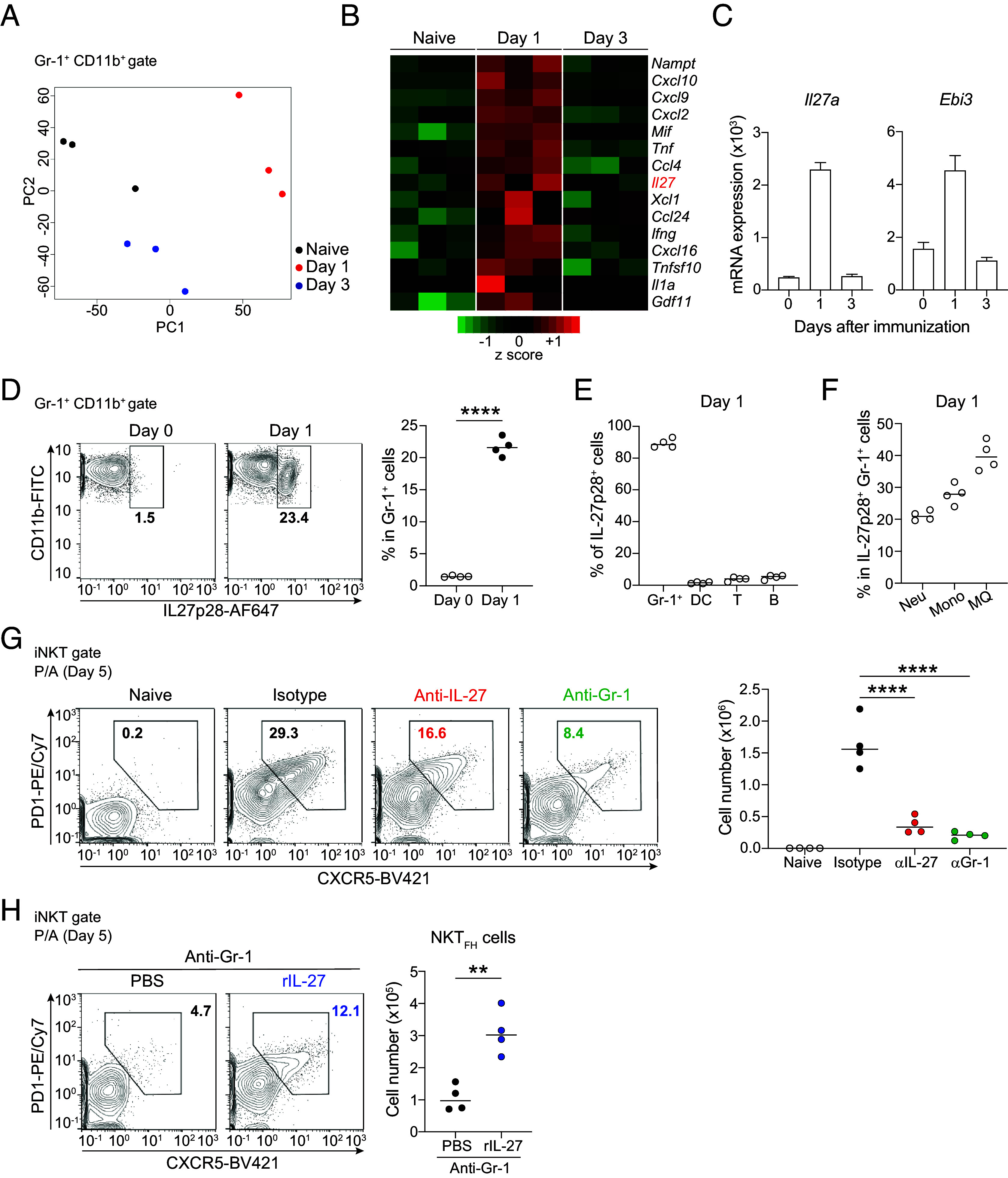 Invariant natural killer T (iNKT) cells are innate-like T lymphocytes that express an invariant T cell receptor α chain and contribute to bridging innate and acquired immunity with rapid production of large amounts of cytokines after stimulation. Among effecter subsets of iNKT cells, follicular helper NKT (NKTFH) cells are specialized to help B cells. However, the mechanisms of NKTFH cell differentiation remain to be elucidated. In this report, we studied the mechanism of NKTFH cell differentiation induced by pneumococcal surface protein A and α-galactosylceramide (P/A) vaccination. We found that Gr-1+ cells helped iNKT cell proliferation and NKTFH cell differentiation in the spleen by producing interleukin-27 (IL-27) in the early phase after vaccination. The neutralization of IL-27 impaired NKTFH cell differentiation, which resulted in compromised antibody production and diminished protection against Streptococcus pneumoniae infection by the P/A vaccine. Our data indicated that Gr-1+ cell-derived IL-27 stimulated mitochondrial metabolism, meeting the energic demand required for iNKT cells to differentiate into NKTFH cells. Interestingly, Gr-1+ cell-derived IL-27 was induced by iNKT cells via interferon-γ production. Collectively, our findings suggest that optimizing the metabolism of iNKT cells was essential for acquiring specific effector functions, and they provide beneficial knowledge on iNKT cell-mediated vaccination-mediated therapeutic strategies.