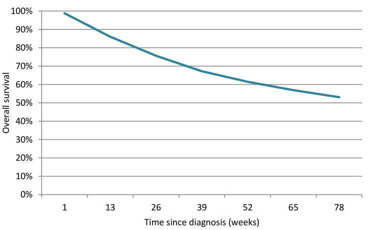 Results: A total of 647 patients (98.6%) died during follow-up. Median OS time was 15.0 weeks (95% CI: 13.5;16.6). Of the 17 candidate predictors, seven were included in the final model: the reason for entering the palliative phase, the number of previous HNSCC, cT, cN, cM, weight loss in the 6 months before diagnosis, and the WHO performance status. The internally validated C-statistic was 0.66 indicating moderate discriminative ability. The model showed some optimism, with a shrinkage factor of 0.89.