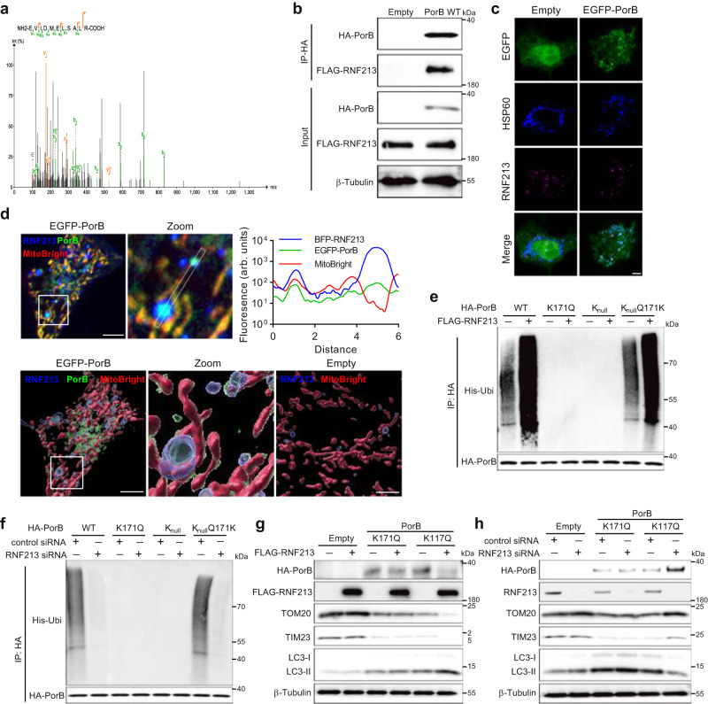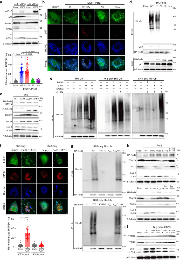 The bacterial pathogen Neisseria gonorrhoeae is able to invade epithelial cells and survive intracellularly. During this process, it secretes outer membrane vesicles (OMVs), however, the mechanistic details for interactions between gonococcal OMVs and epithelial cells and their impact on intracellular survival are currently not established. Here, we show that gonococcal OMVs induce epithelial cell mitophagy to reduce mitochondrial secretion of reactive oxygen species (ROS) and enhance intracellular survival. We demonstrate that OMVs deliver PorB to mitochondria to dissipate the mitochondrial membrane potential, resulting in mitophagy induction through a conventional PINK1 and OPTN/NDP52 mechanism. Furthermore, PorB directly recruits the E3 ubiquitin ligase RNF213, which decorates PorB lysine residue 171 with K63-linked polyubiquitin to induce mitophagy in a p62-dependent manner. These results demonstrate a mechanism in which polyubiquitination of a bacterial virulence factor that targets mitochondria directs mitophagy processes to this organelle to prevent its secretion of deleterious ROS.