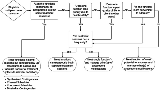A portion of problem behavior is maintained by multiple reinforcement contingencies. Treating multiply controlled problem behavior may be more complex than treating problem behavior maintained by a single contingency. Several approaches for addressing multiply controlled problem behavior have been described in the literature. The purpose of this review is to provide practitioners with an overview of function-based approaches for addressing multiply controlled problem behavior. In particular, we present guidelines for functional analysis and treatment. We also describe strengths and limitations of published treatment approaches and discuss strategies for mitigating these limitations. Finally, we describe areas for future research.