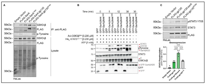 Non-typhoidal Salmonella enterica cause an estimated 1 million cases of gastroenteritis annually in the United States. These serovars use secreted protein effectors to mimic and reprogram host cellular functions. We previously discovered that the secreted effector SarA (Salmonella anti-inflammatory response activator; also known as SteE) was required for increased intracellular replication of S. Typhimurium and production of the anti-inflammatory cytokine interleukin-10 (IL-10). SarA facilitates phosphorylation of STAT3 through a region of homology with the host cytokine receptor gp130. Here, we demonstrate that a single amino acid difference between SarA and gp130 is critical for the anti-inflammatory bias of SarA-STAT3 signaling. An isoleucine at the pY+1 position of the YxxQ motif in SarA (which binds the SH2 domain in STAT3) causes increased STAT3 phosphorylation and expression of anti-inflammatory target genes. This isoleucine, completely conserved in ~4000 Salmonella isolates, renders SarA a better substrate for tyrosine phosphorylation by GSK-3. GSK-3 is canonically a serine/threonine kinase that nonetheless undergoes tyrosine autophosphorylation at a motif that has an invariant isoleucine at the pY+1 position. Our results provide a molecular basis for how a Salmonella secreted effector achieves supraphysiological levels of STAT3 activation to control host genes during infection.