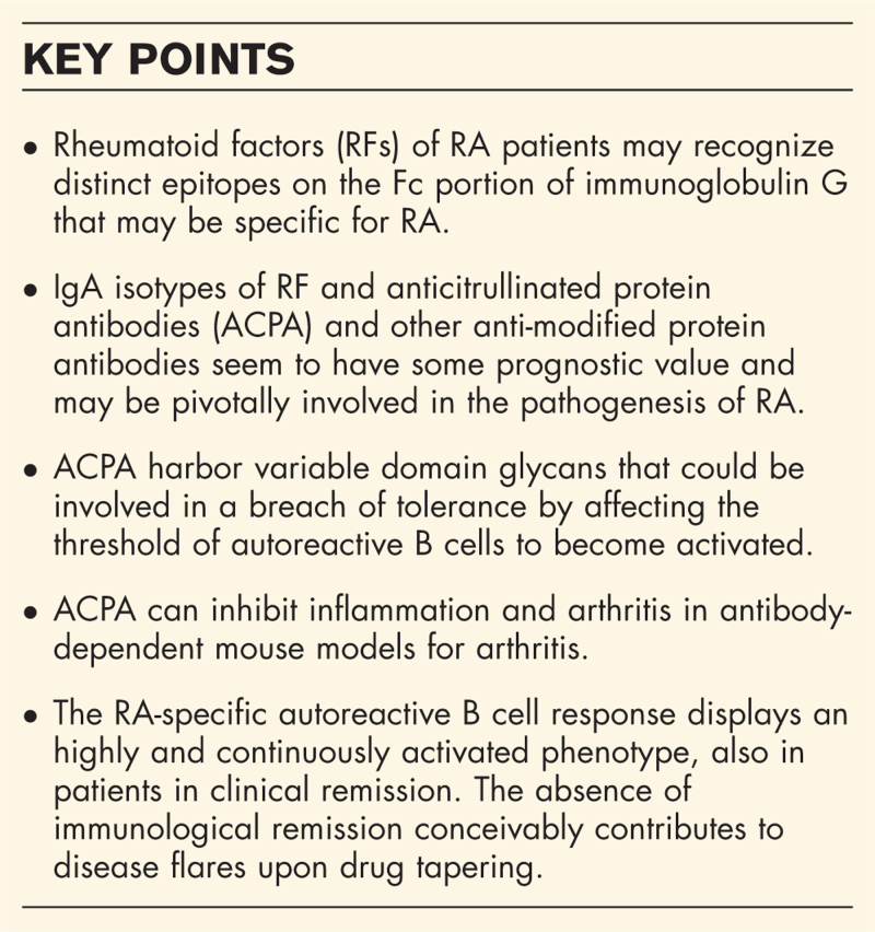 Recent findings: RFs from RA patients seem to target distinct epitopes which appear to be quite specific for RA. Determination of immunoglobulin A (IgA) isotypes of RF and anticitrullinated protein antibodies (ACPA) may provide prognostic information because their presence is associated with reduced therapeutic responses to TNF inhibitors. Furthermore, IgA levels are increased in RA patients and IgA immune complexes are more potent than immunoglobulin G (IgG) complexes in inducing NET formation. Concerning AMPAs, investigations on variable domain glycosylation (VDG) revealed effects on antigen binding and activation of autoreactive B cells. Studies on pathogenetic involvement of ACPA suggest Janus-faced roles: on the one hand, ACPA may be involved in joint destruction and pain perception while on the other hand protective anti-inflammatory effects may be attributed to a subset of ACPAs.