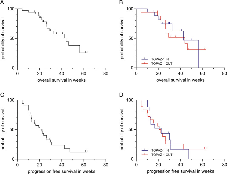 Results: In total, 35 patients, of which 51% met the inclusion criteria of the TOPAZ-1 trial, were analysed. Patients treated within TOPAZ-1 criteria did not have a significantly different median overall survival and progression free survival than the rest of the patients (10.3 versus 9.7 months and 5.3 versus 5 months, respectively). The disease control rate of patients within the TOPAZ-1 criteria was 61.1%, in comparison to 58.8% in the rest of patients. A total of 51 grade 3 and 4 adverse events were observed without significant differences in the subgroups. No specific correlating patterns of genetic alterations with survival and response were observed.