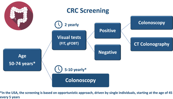 Colorectal cancer (CRC) is a significant global health concern. Diagnostic imaging, using different modalities, has a pivotal role in CRC, from early detection (i.e., screening) to follow-up. The role of imaging in CRC screening depends on each country's approach: if an organized screening program is in place, the role of CT colonography (CTC) is limited to the study of either individuals with a positive stool test unwilling/unable to undergo colonoscopy (CC) or in patients with incomplete CC. Although CC is the most common modality to diagnose CRC, CRC can be also incidentally detected during a routine abdominal imaging examination or at the emergency room in patients presenting with intestinal occlusion/subocclusion or perforation. Staging is a crucial aspect of CRC management, guiding treatment decisions and providing valuable prognostic information. An accurate local staging is mandatory in both rectal and colon cancer to drive the appropriate therapeutic workflow. Important limitations of US, CT, and MR in N-staging can be partially solved by FDG PET/CT. Distant staging is usually managed by CT, with MR and FDG PET/CT which can be used as problem-solving techniques. Follow-up is performed according to the general recommendations of the oncological societies. CLINICAL RELEVANCE STATEMENT: It is essential to summarize each phase of colorectal cancer workup, differentiating the management for colon and rectal cancer supported by the main international guidelines and literature data, with the aim to inform the community on the best practice imaging in colorectal cancer. KEY POINTS: • Colorectal cancer is a prevalent disease that lends itself to imaging at each stage of detection and management. • Various imaging modalities can be used as adjuncts to, or in place of, direct visualization methods of screening and are necessary for evaluating metastatic disease. • Reevaluation of follow-up strategies should be considered depending on patients' individual risk of recurrence.
