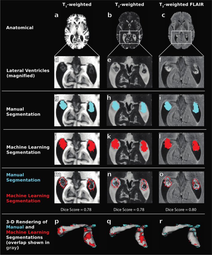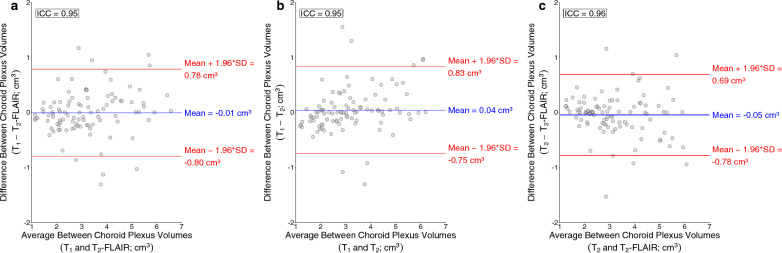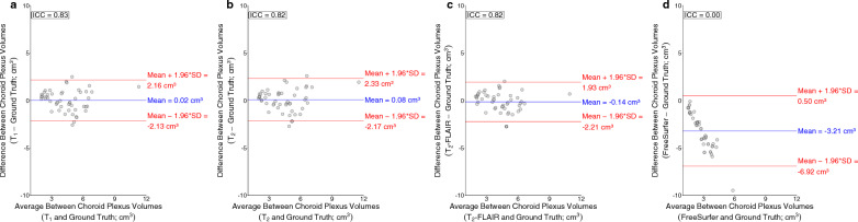 Results: Deep learning results yielded Dice coefficient = 0.72, Hausdorff distance = 1.97 mm, AUC = 0.87 for T1-weighted MRI, Dice coefficient = 0.72, Hausdorff distance = 2.22 mm, AUC = 0.87 for T2-weighted MRI, and Dice coefficient = 0.74, Hausdorff distance = 1.69 mm, AUC = 0.87 for T2-weighted FLAIR MRI; values did not differ significantly between MRI sequences and were statistically improved compared to current commercially-available algorithms (p < 0.001). The intraclass coefficients were 0.95, 0.95, and 0.96 between T1-weighted and T2-weighted FLAIR, T1-weighted and T2-weighted, and T2-weighted and T2-weighted FLAIR models, respectively. Mean lateral ventricle choroid plexus volume across all participants was 3.20 ± 1.4 cm3; a significant, positive relationship (R2 = 0.54-0.60) was observed between participant age and choroid plexus volume for all MRI sequences (p < 0.001).