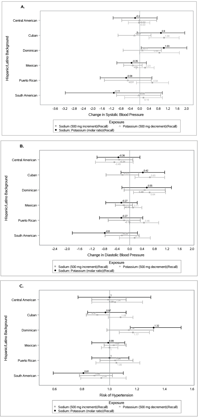 Background: Although the subject of numerous studies, the associations between dietary sodium, potassium, and the ratio of dietary sodium to potassium with blood pressure are not clear-cut. In addition, there is a paucity of research on these relationships in prospective cohort studies with representation from diverse Hispanic/Latino adults.