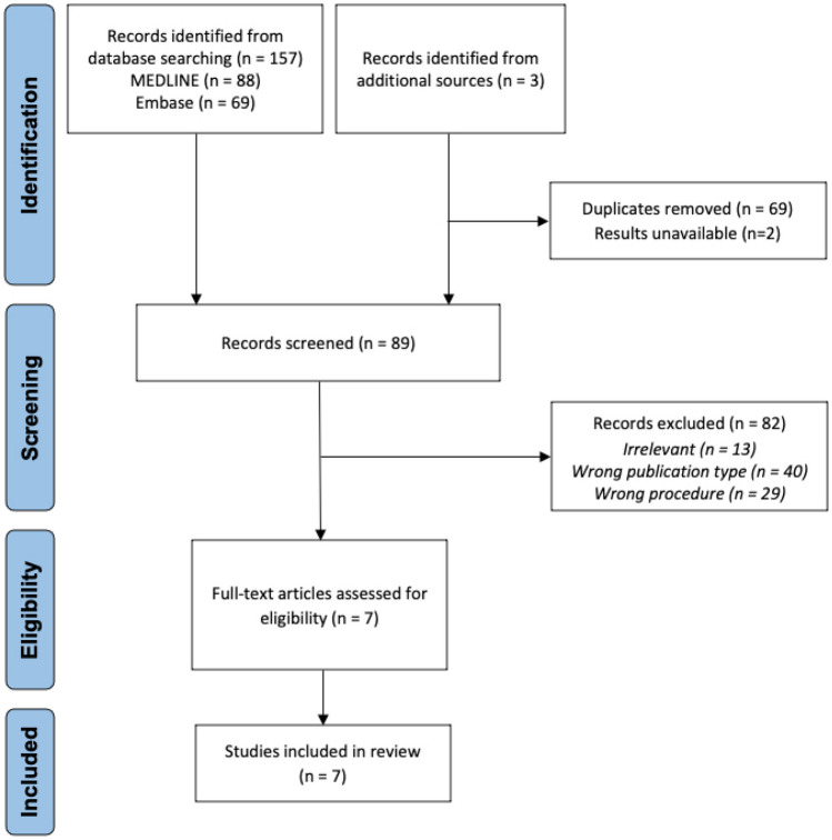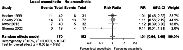Results: Seven studies were included in the final review. No articles were identified that studied pudendal nerve blocks. The difference in numerical pain scores between treatment groups favoured the local anaesthetic group at all timepoints. The mean difference in scores on a 10-point scale was at 1 h,-1.43 (95% CI-2.30 to-0.56, p < 0.01, n = 342 (175 in treatment group)); 6 h,-0.52 (95% CI-1.04 to 0.01, p = 0.05, n = 250 (130 in treatment group)); and 24 h,-0.31 (95% CI-0.82 to 0.19, p = 0.86, n = 247 (127 in treatment group)). Of reported safety outcomes, vasovagal symptoms proceeded to meta-analysis, with a risk ratio of 1.01 (95% CI 0.64-1.60). The quality of the evidence was rated down to 'low' due to inconsistency and imprecision.