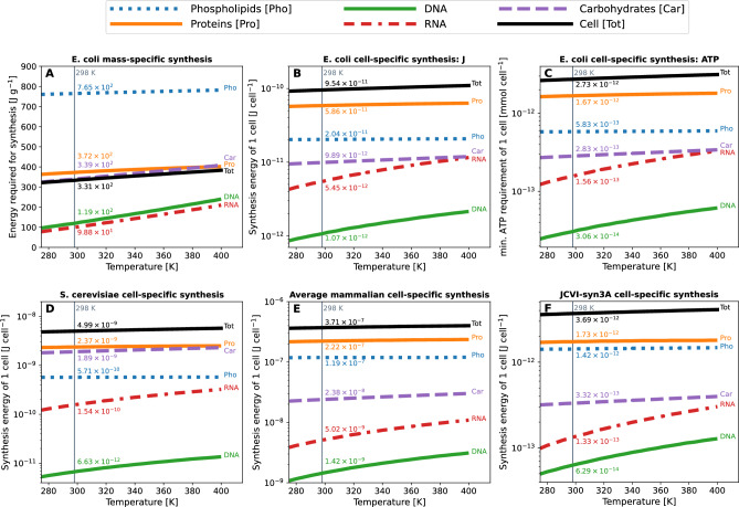 Understanding the energy requirements for cell synthesis accurately and comprehensively has been a longstanding challenge. We introduce a computational model that estimates the minimum energy necessary to build any cell from its constituent parts. This method combines omics and internal cell compositions from various sources to calculate the Gibbs Free Energy of biosynthesis independently of specific metabolic pathways. Our public tool, Synercell, can be used with other models for minumum species-specific energy estimations in any well-sequenced species. The energy for synthesising the genome, transcriptome, proteome, and lipid bilayer of four cell types: Escherichia coli, Saccharomyces cerevisiae, an average mammalian cell and JCVI-syn3A were estimated. Their modelled minimum synthesis energies at 298 K were J/cell, J/cell, J/cell and respectively. Gram-for-gram synthesis of lipid bilayers requires the most energy, followed by the proteome, genome, and transcriptome. The average per gram cost of biomass synthesis is in the 300s of J/g for all four cells. Implications for the generalisability of cell construction and applications to biogeosciences, cellular biology, biotechnology, and astrobiology are discussed.