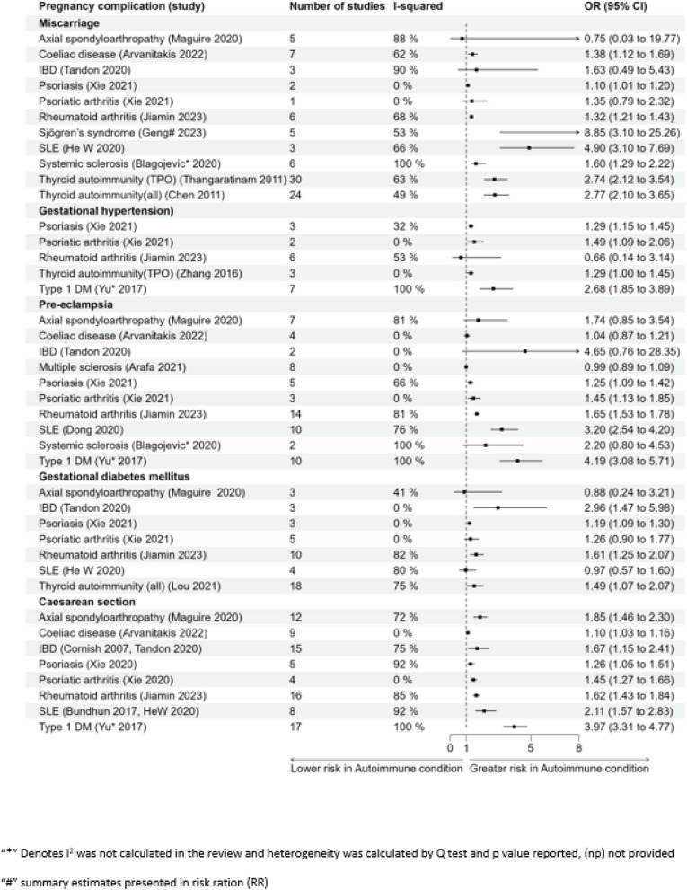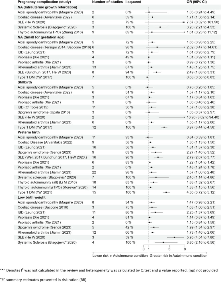 Results: Thirty-two reviews were included consisting of 709 primary studies. The review reported the association between 12 autoimmune conditions and 16 adverse pregnancy outcomes. Higher risk of miscarriage is reported in women with Sjögren's syndrome RR 8.85 (95% CI 3.10-25.26) and systemic lupus erythematosus (SLE) OR 4.90 (3.10-7.69). Pre-eclampsia was reported higher in women with type 1 diabetes mellitus (T1DM) OR 4.19 (3.08-5.71) and SLE OR 3.20 (2.54-4.20). Women reported higher risk of diabetes during pregnancy with inflammatory bowel disease (IBD) OR 2.96 (1.47-5.98). There was an increased risk of intrauterine growth restriction in women with systemic sclerosis OR 3.20 (2.21-4.53) and coeliac disease OR 1.71 (1.36-2.14). Preterm birth was associated with T1DM OR 4.36 (3.72-5.12) and SLE OR 2.79 (2.07-3.77). Low birth weight babies were reported in women with women with SLE or systemic sclerosis OR 5.95 (4.54-7.80) and OR 3.80 (2.16-6.56), respectively. There was a higher risk of stillbirth in women with T1DM OR 3.97 (3.44-4.58), IBD OR 1.57 (1.03-2.38), and coeliac disease OR 1.57 (1.17-2.10). T1DM in women was associated with 32% lower odds of small for gestational age baby OR 0.68 (0.56-0.83).