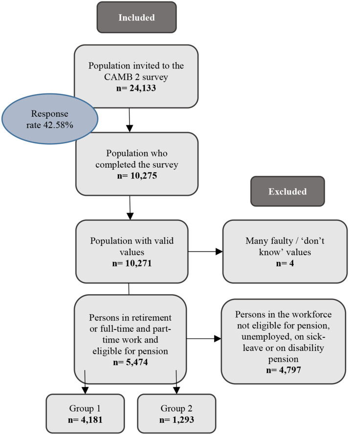 Methods: The study population consisted of 5,474 respondents to the Copenhagen Aging and Midlife Biobank (CAMB) 2021 survey, divided into two groups. The first group included subjects (n = 1,293) who stayed longer in the workforce even though they had the possibility to retire. The second group consisted of subjects who had retired full-time at the time of the survey (n = 4,181). Survey data was linked to register data to provide a broader dataset. In order to investigate the heterogeneity between the two groups in terms of important socio-economic, work-related and health-related variables, t-test, Mann-Whitney U (Wilcoxon Rank) test, and chi-square tests were employed. Further, to examine the probability of an individual working after retirement age a logit model with step-wise inclusion was utilized.