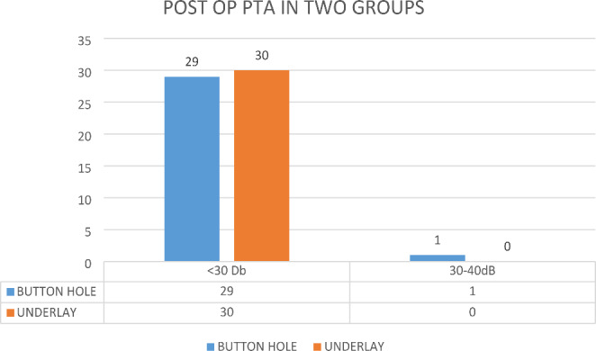 Results: In Button hole tympanoplasty group the mean hearing gain was 9.3dB, and 8.17 dB in Underlay tympanoplasty group which was statistically significant (p < 0.05) but P value between Button hole and Underlay tympanoplasty was not statistically significant.With regard to graft uptake 96.7% showed graft uptake in Buttonhole tympanoplasty group and in underlay tympanoplasty the graft uptake was 93.3%.