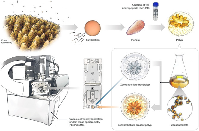 Coral reef ecosystems supported by environmentally sensitive reef-building corals face serious threats from human activities. Our understanding of these reef threats is hampered by the lack of sufficiently sensitive coral environmental impact assessment systems. In this study, we established a platform for metabolomic analysis at the single-coral-polyp level using state-of-the-art mass spectrometry (probe electrospray ionization/tandem mass spectrometry; PESI/MS/MS) capable of fine-scale analysis. We analyzed the impact of the organic UV filter, benzophenone (BP), which has a negative impact on corals. We also analyzed ammonium and nitrate samples, which affect the environmental sensitivity of coral-zooxanthella (Symbiodiniaceae) holobionts, to provide new insights into coral biology with a focus on metabolites. The method established in this study breaks new ground by combining PESI/MS/MS with a technique for coral polyps that can control the presence or absence of zooxanthellae in corals, enabling functions of zooxanthellae to be assessed on a polyp-by-polyp basis for the first time. This system will clarify biological mechanisms of corals and will become an important model system for environmental impact assessment using marine organisms.