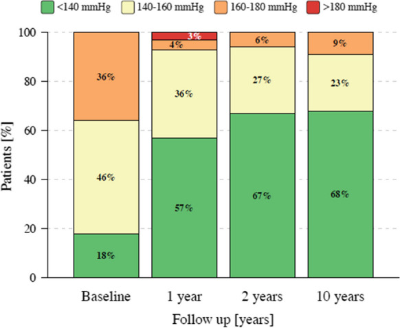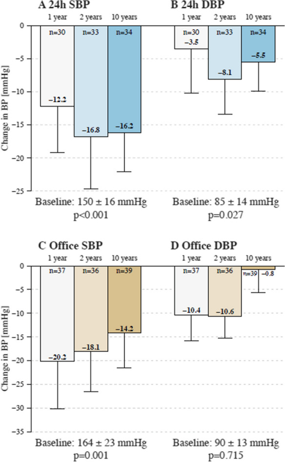 Results: Thirty-nine patients completed the 10-year follow-up (mean follow-up duration 9.4 ± 0.7 years). Baseline office and 24-h ambulatory systolic blood pressure were 164 ± 23 mmHg and 153 ± 16 mmHg, respectively. After 10 years, 24-h ambulatory and office systolic blood pressure were reduced by 16 ± 17 mmHg (P < 0.001) and 14 ± 23 mmHg (P = 0.001), respectively. The number of antihypertensive drugs remained unchanged from 4.9 ± 1.4 to 4.5 ± 1.2 drugs (P = 0.087). The estimated glomerular filtration rate declined within the expected range from 69 (95% CI 63 to 74) to 60 mL/min/1.73m2 (95% CI 53 to 68; P < 0.001) through 10-year follow-up. Three renal artery interventions were documented for progression of pre-existing renal artery stenosis in two patients and one patient with new-onset renal artery stenosis. No other adverse events were observed during the follow-up.
