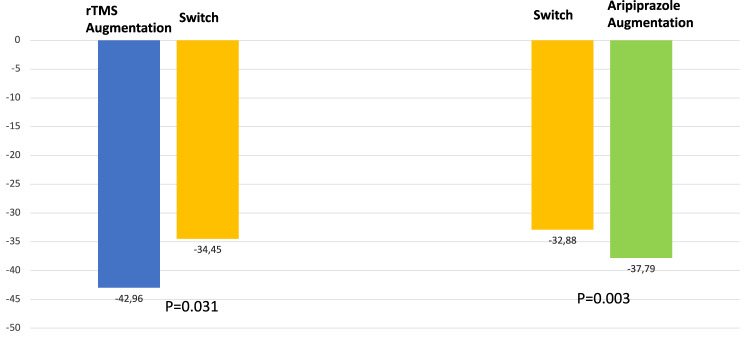 Further research is needed to help improve both the standard of care and the outcome for patients with treatment-resistant depression. A particularly critical evidence gap exists with respect to whether pharmacological or non-pharmacological augmentation is superior to antidepressant switch, or vice-versa. The objective of this study was to compare the effectiveness of augmentation with aripiprazole or repetitive transcranial magnetic stimulation versus switching to the antidepressant venlafaxine XR (or duloxetine for those not eligible to receive venlafaxine) for treatment-resistant depression. In this multi-site, 8-week, randomized, open-label study, 278 subjects (196 females and 82 males, mean age 45.6 years (SD 15.3)) with treatment-resistant depression were assigned in a 1:1:1 fashion to treatment with either of these three interventions; 235 subjects completed the study. 260 randomized subjects with at least one post-baseline Montgomery-Asberg Depression Rating (MADRS) assessment were included in the analysis. Repetitive transcranial magnetic stimulation (score change (standard error (se)) = -17.39 (1.3) (p = 0.015) but not aripiprazole augmentation (score change (se) = -14.9 (1.1) (p = 0.069) was superior to switch (score change (se) = -13.22 (1.1)) on the MADRS. Aripiprazole (mean change (se) = -37.79 (2.9) (p = 0.003) but not repetitive transcranial magnetic stimulation augmentation (mean change (se) = -42.96 (3.6) (p = 0.031) was superior to switch (mean change (se) = -34.45 (3.0)) on the symptoms of depression questionnaire. Repetitive transcranial magnetic stimulation augmentation was shown to be more effective than switching antidepressants in treatment-resistant depression on the study primary measure. In light of these findings, clinicians should consider repetitive transcranial magnetic stimulation augmentation early-on for treatment-resistant depression.Trial registration: ClinicalTrials.gov, NCT02977299.