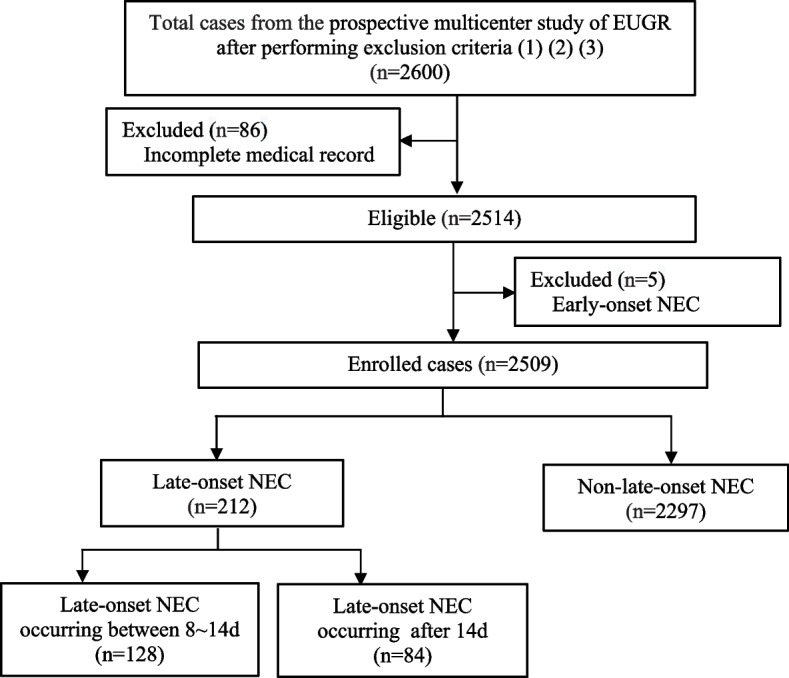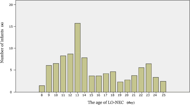 Results: Compared with the non-LO-NEC group, the LO-NEC group had a higher proportion of anemia, blood transfusion, and invasive mechanical ventilation (IMV) treatments before NEC; the LO-NEC group infants had a longer fasting time, required longer duration to achieve the target total caloric intake (110 kcal/kg) and regain birthweight, and showed slower weight growth velocity; the cumulative dose of the medium-chain and long-chain triglyceride (MCT/LCT) emulsion intake in the first week after birth was higher and breastfeeding rate was lower. Additionally, similar results including a higher proportion of IMV, lower breastfeeding rate, more MCT/LCT emulsion intake, slower growth velocity were also found in the LO-NEC group occurring between 8 ~ 14d when compared to the LO-NEC group occurring after 14 d (all (P < 0.05). After adjustment for the confounding factors, high proportion of breastfeeding were identified as protective factors and long fasting time before NEC were identified as risk factors for LO-NEC; early feeding were identified as protective factors and low gestational age, grade III ~ IV neonatal respiratory distress syndrome (NRDS), high accumulation of the MCT/LCT emulsion in the first week were identified as risk factors for LO-NEC occurring between 8 ~ 14d. Logistic regression analysis showed that LO-NEC was a risk factor for late-onset sepsis, parenteral nutrition-associated cholestasis, metabolic bone disease of prematurity, and extrauterine growth retardation.
