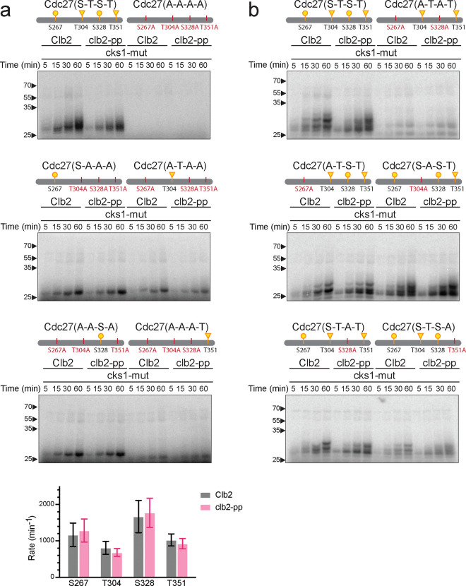 Cell cycle progression is governed by complexes of the cyclin-dependent kinases (CDKs) and their regulatory subunits cyclin and Cks1. CDKs phosphorylate hundreds of substrates, often at multiple sites. Multisite phosphorylation depends on Cks1, which binds initial priming phosphorylation sites to promote secondary phosphorylation at other sites. Here, we describe a similar role for a recently discovered phosphate-binding pocket (PP) on B-type cyclins. Mutation of the PP in Clb2, the major mitotic cyclin of budding yeast, alters bud morphology and delays the onset of anaphase. Mutation of the PP reduces multi-site phosphorylation of CDK substrates in vitro, including the Cdc16 and Cdc27 subunits of the anaphase-promoting complex/cyclosome and the Bud6 and Spa2 subunits of the polarisome. We conclude that the cyclin PP, like Cks1, controls the pattern of multisite phosphorylation on CDK substrates, thereby helping to establish the robust timing of cell-cycle events.