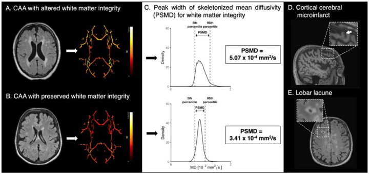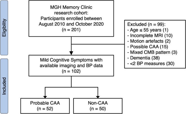 Methods: Using a prospective memory clinic cohort, we enrolled 102 participants, of whom 52 with probable CAA. All underwent a 3-tesla research MRI at baseline and annual neuropsychological evaluation over 2 years, for which standardized z-scores for four cognitive domains were calculated. BPV was assessed using a coefficient of variation derived from serial outpatient BP measurements (median 12) over five years. We measured the peak width of skeletonized mean diffusivity (PSMD) as a marker of white matter integrity, and other neuroimaging markers of CAA, including lacunes and cortical cerebral microinfarcts. Using regression models, we evaluated the association of BPV with microstructural brain injury and whether CAA modified this association. We also examined the association of BPV with subsequent cognitive decline.