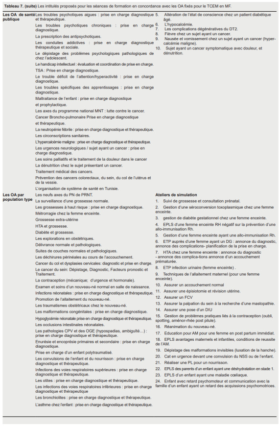 Introduction-Objectif: Le troisième cycle des études médicales (TCEM) dure 3 ans pour la spécialité de médecine de famille (MF) en Tunisie. Les membres du comité de MF à la Faculté de Médecine de Monastir (FMM) visaient à détailler les Objectifs d’Apprentissage (OA) pour les résidents en MF.Méthode: Nous avons utilisé la méthode Delphi en 2 tours incluant un groupe d’experts nommé Groupe de Rédaction des Objectifs d’Apprentissage en MF (GROAMF) à la FMM. Le GROAMF comportait 74 médecins hospitalo-universitaires et des maîtres de stage en MF. Ces membres ont participé activement aux 10 réunions réalisées durant le mois de Mars 2022. Trois points ont été discutés : l’identification des OA, l’élaboration des intitulés des formations et la proposition des méthodes pédagogiques à adopter. La rédaction était subdivisée en 5 domaines : OA transversaux, de santé publique, par population type, par présentation clinique et par système. Résultats: Ont été identifiés 1359 OA, dont 552 étaient des OA présentés par système (40,5%). L’apprentissage incluait 618 intitulés de séances de formation. Les résidents auront, pour chaque niveau du TCEM, une journée de formation académique au rythme d’une semaine sur trois durant 9 mois. Conclusion: Un consensus spécifique à la MF a été développé avec la participation de toutes les spécialités médicales. Il sera une base d’apprentissage pour les apprenants, une référence pour les encadrants et les enseignants en TCEM.