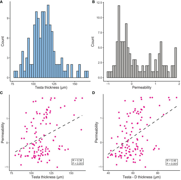 Discussion: Results indicate loss of seed coat dormancy during domestication was not primarily driven by reduced testa thickness or smooth seededness. The close association between major permeability and thickness QTL and Mendel's 'A' warrant further study, particularly regarding the role of flavonoids.