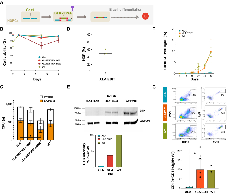 Conclusions: Gene editing efficiencies above 30% could be consistently achieved in human HSPCs. Given the potential selective advantage of corrected cells, as suggested by skewed X-linked inactivation in carrier females and by competitive repopulating experiments in mouse models, this work demonstrates the potential of this strategy as a future definitive therapy for XLA.