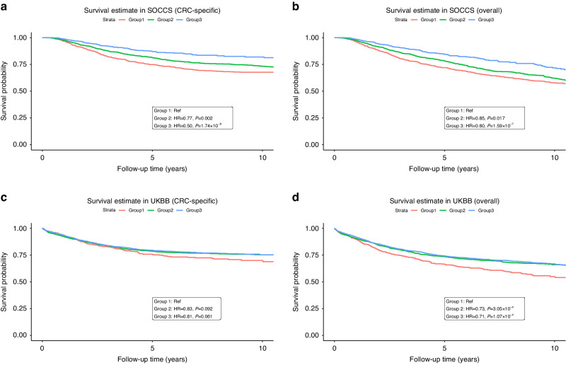 Methods: We conducted analyses among the Study of Colorectal Cancer in Scotland (SOCCS) and the UK Biobank (UKBB). Both cancer-specific survival (CSS) and overall survival (OS) outcomes were examined. The 25-OHD levels were categorised into three groups, and multi-variable Cox-proportional hazard models were applied to estimate hazard ratios (HRs). We performed individual-level Mendelian randomisation (MR) through the generated polygenic risk scores (PRS) of 25-OHD and summary-level MR using the inverse-variance weighted (IVW) method.