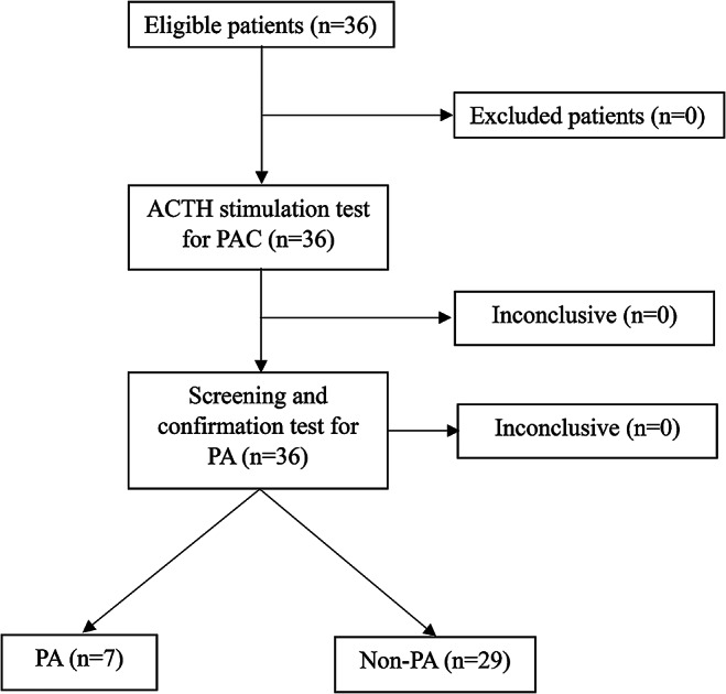 Methods: A cross-sectional study with a total of 36 patients with an aldosterone-renin ratio (ARR) > 20 ng/dL per ng/m/hr were included. The confirmation test for PA was performed by saline infusion and the patients were categorized into PA and non-PA. PAC was collected at 20 and 40 min after 1 µg ACTH stimulation test. Multivariable logistic regression analysis was performed, and the associations are presented as odds ratios (OR) and 95% confidence intervals (CI). Diagnostic accuracy is presented as AuROC.