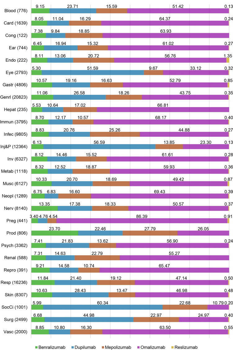 Results: Overall, 31,724,381 ICSRs were identified in VigiBase and 167,282 (0.5%) were related to study drugs; the remaining reports were considered as RG1. Stratifying all biologic-related ICSRs by therapeutic indication, around 29.4% (n = 48,440) concerned asthma use; omalizumab was mainly indicated as the suspected drug (n = 20,501), followed by dupilumab, mepolizumab, benralizumab and reslizumab. Most asthma ICSRs concerned adults (57%) and women (64.1%). Asthma biologics showed a higher frequency of serious suspected ADR reporting than RG1 (41.3% vs 32.3%). The most reported suspected ADRs included asthma, dyspnea, product use issue, drug ineffective, cough, headache, fatigue and wheezing. Asthma biologics were disproportionally associated with several unknown or less documented adverse events, such as malignancies, pulmonary embolism and deep vein thrombosis with omalizumab; alopecia and lichen planus with dupilumab; alopecia and herpes infections with mepolizumab; alopecia, herpes zoster and eosinophilic granulomatosis with polyangiitis related to benralizumab; and alopecia with reslizumab.