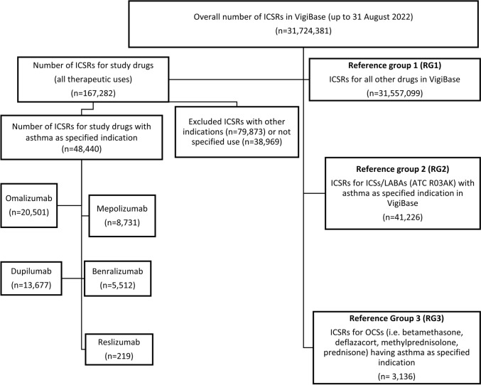 Methods: We selected all de-duplicated individual case safety reports (ICSRs) attributed to five approved biologics for severe asthma in VigiBase, up to 31st August 2022 (omalizumab, mepolizumab, reslizumab, benralizumab and dupilumab). Descriptive frequency analyses of ICSRs were carried out both as a whole class and as individual products. Reporting odds ratios (ROR) with 95% confidence intervals (CIs) were used as the measure of disproportionality for suspected adverse drug reactions (ADRs) associated with the study drugs compared with either all other suspected drugs (Reference Group 1, RG1) or inhaled corticosteroids plus long-acting β-agonists (ICSs/LABAs) (Reference Group 2, RG2) or with oral corticosteroids (OCSs) (Reference Group 3, RG3).