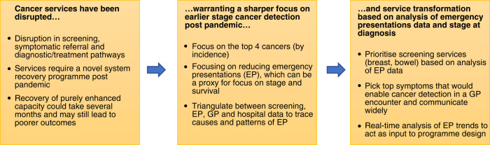 This paper outlines the impact of the COVID-19 pandemic on cancer services in the UK including screening, symptomatic diagnosis, treatment pathways and projections on clinical outcomes as a result of these care disruptions. A restoration of cancer services to pre-pandemic levels is not likely to mitigate this adverse impact, particularly with an ageing population and increased cancer burden. New cancer cases are projected to rise to over 500,000 per year by 2035, with over 4 million people living with and beyond cancer. This paper calls for a strategic transformation to prioritise effort on the basis of available datasets and evidence-in particular, to prioritise cancers where an earlier diagnosis is feasible and clinically useful with a focus on mortality benefit by preventing emergency presentations by harnessing data and analytics. This could be delivered by a focus on underperforming groups/areas to try and reduce inequity, linking near real-time datasets with clinical decision support systems at the primary and secondary care levels, promoting the use of novel technologies to improve patient uptake of services, screening and diagnosis, and finally, upskilling and cross-skilling healthcare workers to expand supply of diagnostic and screening services.