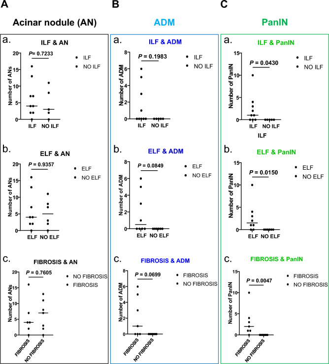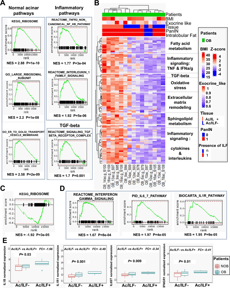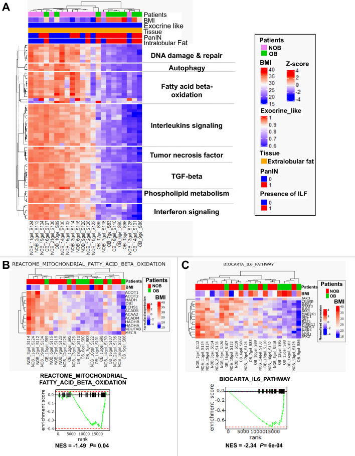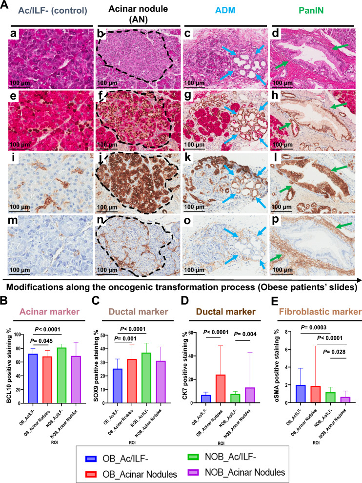 Although pancreatic precancerous lesions are known to be related to obesity and fatty pancreatic infiltration, the mechanisms remain unclear. We assessed the role of fatty infiltration in the process of pancreatic oncogenesis and obesity. A combined transcriptomic, lipidomic and pathological approach was used to explore neoplastic transformations. Intralobular (ILF) and extralobular (ELF) lipidomic profiles were analyzed to search for lipids associated with pancreatic intraepithelial neoplasia (PanINs) and obesity; the effect of ILF and ELF on acinar tissue and the histopathological aspects of pancreatic parenchyma changes in obese (OB) and non-obese patients. This study showed that the lipid composition of ILF was different from that of ELF. ILF was related to obesity and ELF-specific lipids were correlated to PanINs. Acinar cells were shown to have different phenotypes depending on the presence and proximity to ILF in OB patients. Several lipid metabolic pathways, oxidative stress and inflammatory pathways were upregulated in acinar tissue during ILF infiltration in OB patients. Early acinar transformations, called acinar nodules (AN) were linked to obesity but not ELF or ILF suggesting that they are the first reversible precancerous pancreatic lesions to occur in OB patients. On the other hand, the number of PanINs was higher in OB patients and was positively correlated to ILF and ELF scores as well as to fibrosis. Our study suggests that two types of fat infiltration must be distinguished, ELF and ILF. ILF plays a major role in acinar modifications and the development of precancerous lesions associated with obesity, while ELF may play a role in the progression of PDAC.