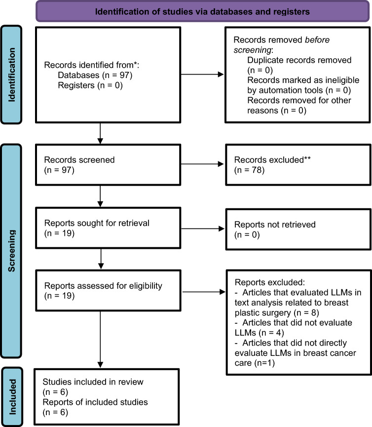 Methods: We searched MEDLINE for relevant studies published before December 22, 2023. Keywords included: "large language models", "LLM", "GPT", "ChatGPT", "OpenAI", and "breast". The risk bias was evaluated using the QUADAS-2 tool.