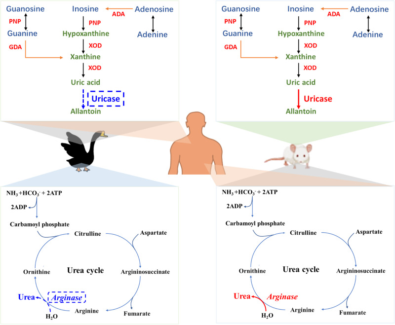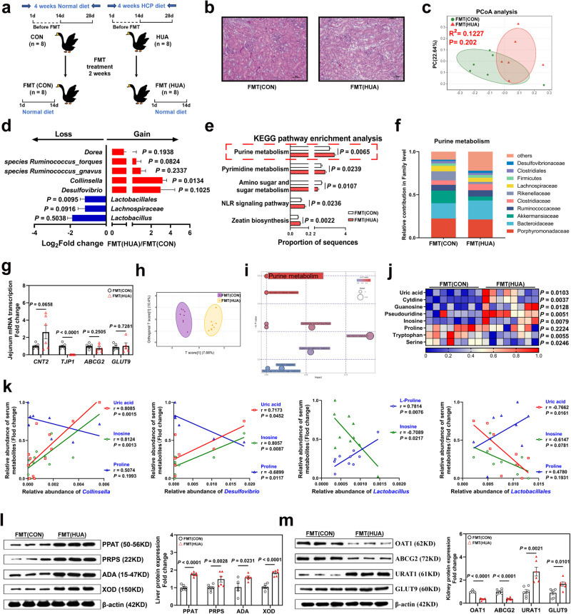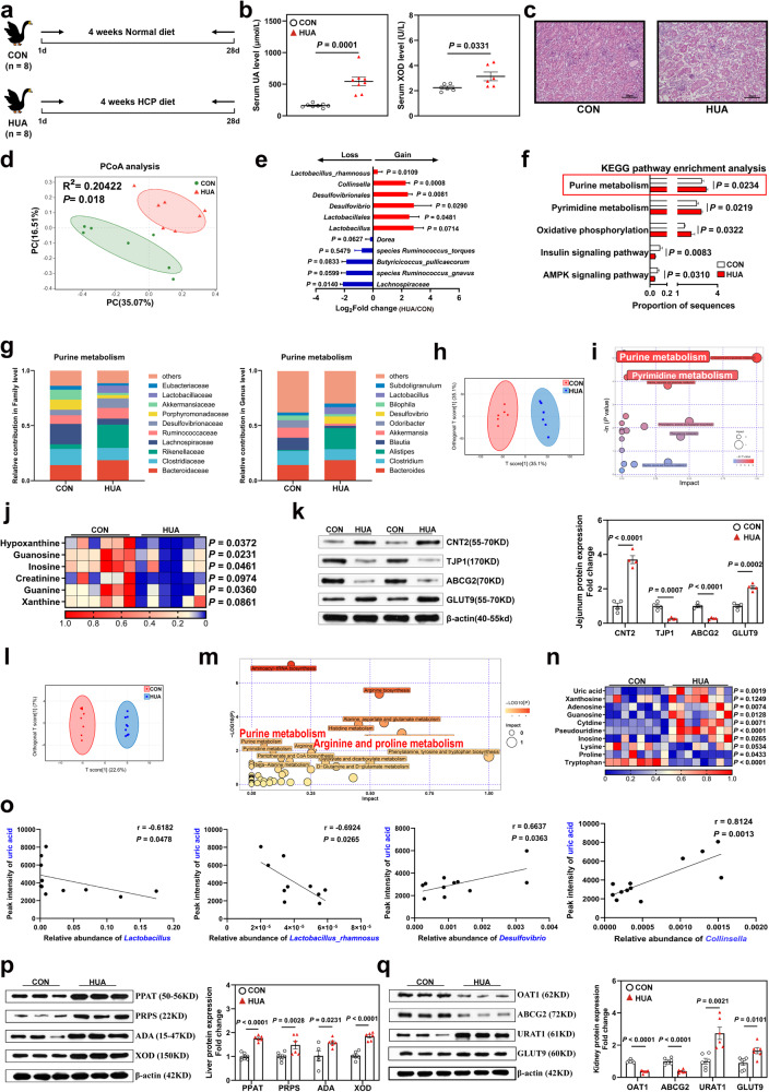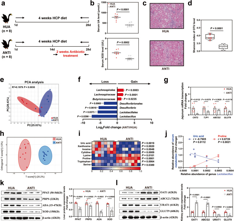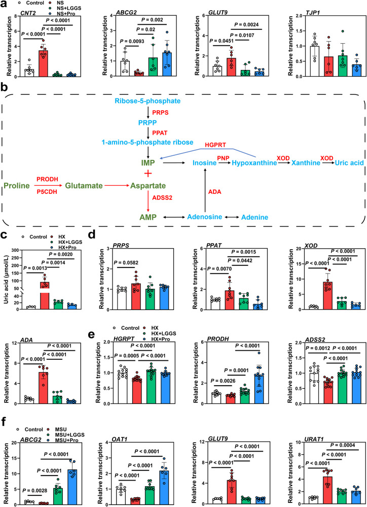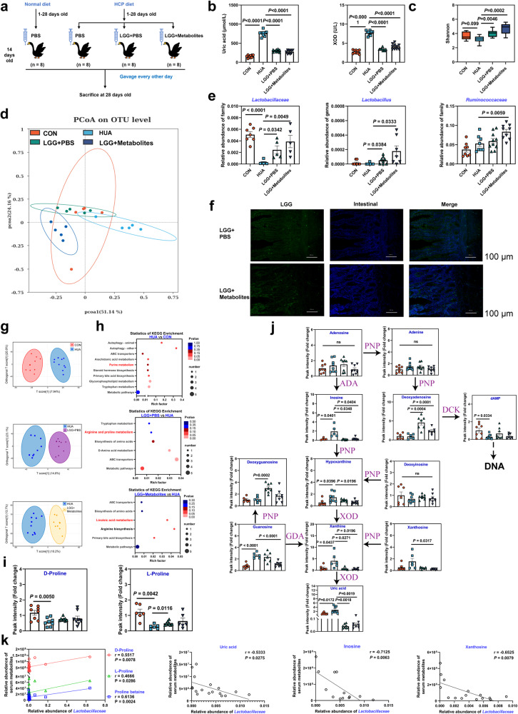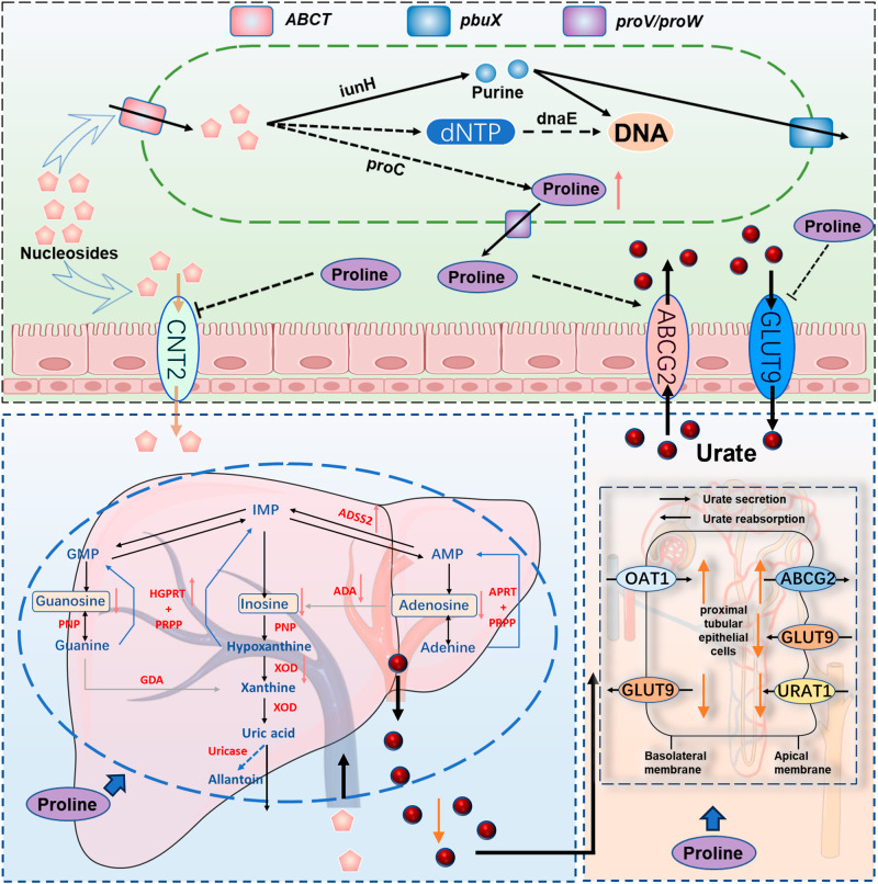 Hyperuricemia (HUA) is a metabolic syndrome caused by abnormal purine metabolism. Although recent studies have noted a relationship between the gut microbiota and gout, whether the microbiota could ameliorate HUA-associated systemic purine metabolism remains unclear. In this study, we constructed a novel model of HUA in geese and investigated the mechanism by which Lactobacillus rhamnosus GG (LGG) could have beneficial effects on HUA. The administration of antibiotics and fecal microbiota transplantation (FMT) experiments were used in this HUA goose model. The effects of LGG and its metabolites on HUA were evaluated in vivo and in vitro. Heterogeneous expression and gene knockout of LGG revealed the mechanism of LGG. Multi-omics analysis revealed that the Lactobacillus genus is associated with changes in purine metabolism in HUA. This study showed that LGG and its metabolites could alleviate HUA through the gut-liver-kidney axis. Whole-genome analysis, heterogeneous expression, and gene knockout of LGG enzymes ABC-type multidrug transport system (ABCT), inosine-uridine nucleoside N-ribohydrolase (iunH), and xanthine permease (pbuX) demonstrated the function of nucleoside degradation in LGG. Multi-omics and a correlation analysis in HUA patients and this goose model revealed that a serum proline deficiency, as well as changes in Collinsella and Lactobacillus, may be associated with the occurrence of HUA. Our findings demonstrated the potential of a goose model of diet-induced HUA, and LGG and proline could be promising therapies for HUA.