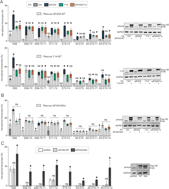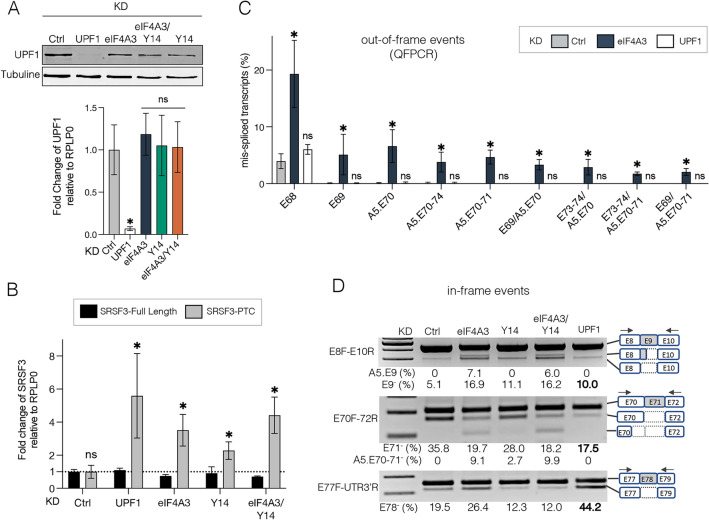 Deposition of the exon junction complex (EJC) upstream of exon-exon junctions helps maintain transcriptome integrity by preventing spurious re-splicing events in already spliced mRNAs. Here we investigate the importance of EJC for the correct splicing of the 2.2-megabase-long human DMD pre-mRNA, which encodes dystrophin, an essential protein involved in cytoskeletal organization and cell signaling. Using targeted RNA-seq, we show that knock-down of the eIF4A3 and Y14 core components of EJC in a human muscle cell line causes an accumulation of mis-splicing events clustered towards the 3' end of the DMD transcript (Dp427m). This deregulation is conserved in the short Dp71 isoform expressed ubiquitously except in adult skeletal muscle and is rescued with wild-type eIF4A3 and Y14 proteins but not with an EJC assembly-defective mutant eIF4A3. MLN51 protein and EJC-associated ASAP/PSAP complexes independently modulate the inclusion of the regulated exons 71 and 78. Our data confirm the protective role of EJC in maintaining splicing fidelity, which in the DMD gene is necessary to preserve the function of the critical C-terminal protein-protein interaction domain of dystrophin present in all tissue-specific isoforms. Given the role of the EJC in maintaining the integrity of dystrophin, we asked whether the EJC could also be involved in the regulation of a mechanism as complex as skeletal muscle differentiation. We found that eIF4A3 knockdown impairs myogenic differentiation by blocking myotube formation. Collectively, our data provide new insights into the functional roles of EJC in human skeletal muscle.