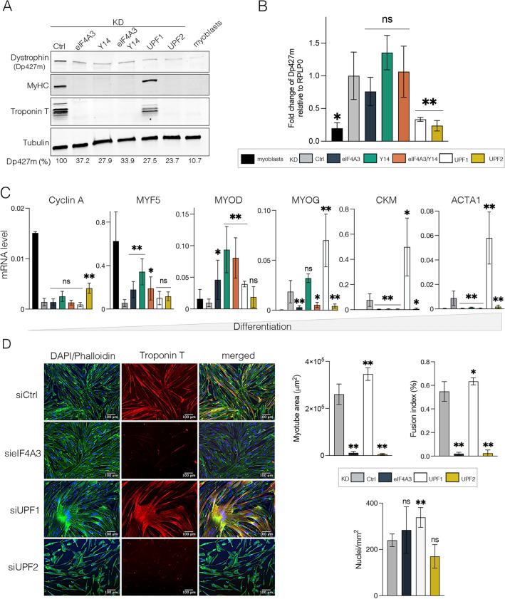 Keywords: Duchenne muscular dystrophy; Myoblasts differentiation; Nonsense mediated mRNA Decay (NMD); PININ; RNPS1; UPF1.