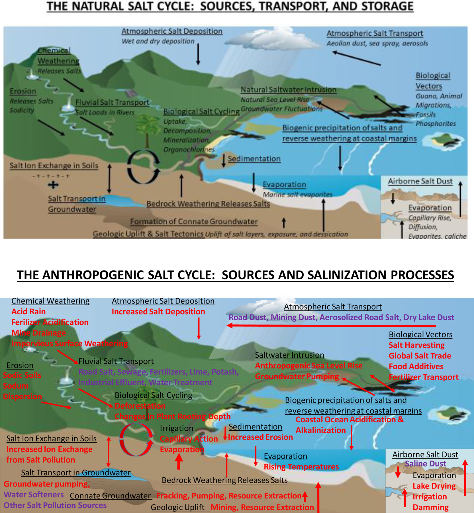 Increasing salt production and use is shifting the natural balances of salt ions across Earth systems, causing interrelated effects across biophysical systems collectively known as freshwater salinization syndrome. In this Review, we conceptualize the natural salt cycle and synthesize increasing global trends of salt production and riverine salt concentrations and fluxes. The natural salt cycle is primarily driven by relatively slow geologic and hydrologic processes that bring different salts to the surface of the Earth. Anthropogenic activities have accelerated the processes, timescales and magnitudes of salt fluxes and altered their directionality, creating an anthropogenic salt cycle. Global salt production has increased rapidly over the past century for different salts, with approximately 300 Mt of NaCl produced per year. A salt budget for the USA suggests that salt fluxes in rivers can be within similar orders of magnitude as anthropogenic salt fluxes, and there can be substantial accumulation of salt in watersheds. Excess salt propagates along the anthropogenic salt cycle, causing freshwater salinization syndrome to extend beyond freshwater supplies and affect food and energy production, air quality, human health and infrastructure. There is a need to identify environmental limits and thresholds for salt ions and reduce salinization before planetary boundaries are exceeded, causing serious or irreversible damage across Earth systems.