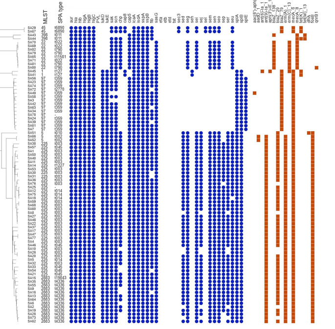 Results: Most MRSA carried SCCmec II (63.4%), followed by SCCmec IV (34.1%) and SCCmec V (2.5%). A high proportion of strains belonging to the ST225 lineage (45.1%) was observed, followed by ST97 (18.3%), ST2883 (15.9%), ST22 (9.8%), ST5 (3.7%), and the ST1, ST398 and ST45 lineages (2.4% each). Sixteen different spa types were identified, predominantly ST225-t003 (31.7%), ST97-t359 (15.9%), and ST2883-t4336 (14.6%). None of the strains carried Panton-Valentine leukocidin, exfoliative toxins, or toxic shock toxin. All MRSA strains were susceptible to linezolid, rifampicin, vancomycin, teicoplanin, and trimethoprim-sulfamethoxazole. MRSA strains were resistant to erythromycin, clindamycin, tetracycline and gentamicin, with a frequency of 74.4%, 74.4%, 8.5%, and 1.2%, respectively.