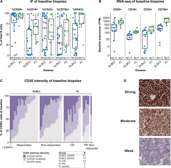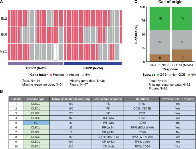 Results: Baseline tumor biopsies showed that almost all patients had high proportions of B cells that expressed the CD20 target antigen, whereas expression of other B-cell surface antigens (CD19, CD22, CD79b) was more variable. Responses to odronextamab in patients with diffuse large B-cell lymphoma were not related to the relative level of baseline CD20 expression, cell of origin, or high-risk molecular subtype. A potential link was observed between greater tumor programmed cell death-ligand 1 expression and increased likelihood of response to odronextamab. Similarly, a trend was observed between clinical response and increased levels of CD8 T cells and regulatory T cells at baseline. We also identified an on-treatment pharmacodynamic shift in intratumoral immune cell subsets. Finally, loss of CD20 expression through inactivating gene mutations was identified as a potential mechanism of resistance in patients who were treated with odronextamab until progression, as highlighted in two detailed patient cases reported here.