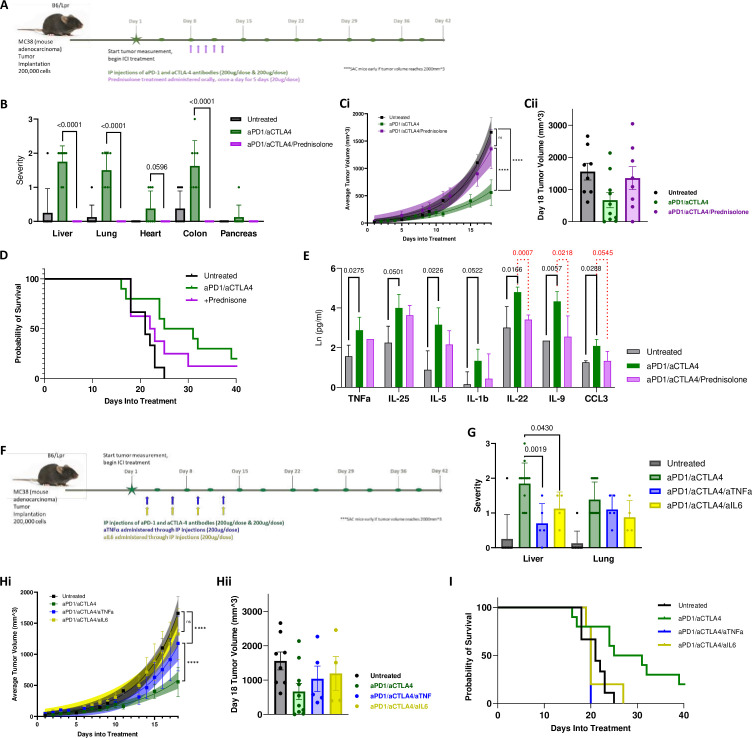 Methods: Using a translationally relevant murine model of anti-PD-1 and anti-CTLA-4 antibodies-induced irAEs, we compared the safety and efficacy of prednisolone, anti-IL-6, anti-TNFɑ, anti-IL-25 (IL-17E), and anti-IL-17RA (the receptor for IL-25) administration to prevent irAEs and to reduce tumor size.